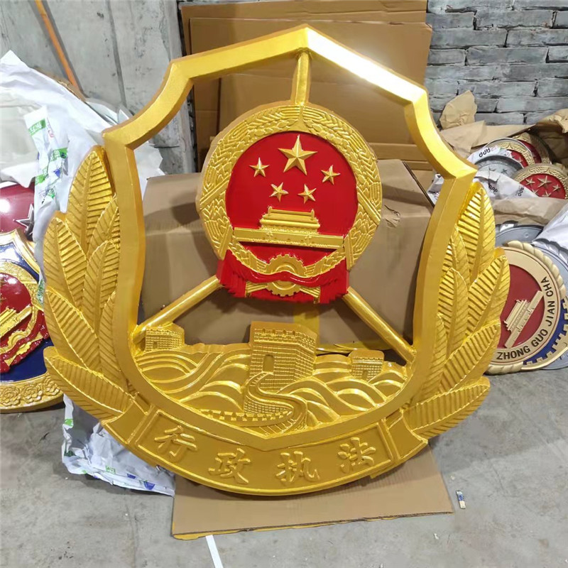 ,整体为盾形,两侧为橄榄枝下面为五朵牡丹花,盾牌中间为国徽,国徽后面的飘带呈人字形分布。以此来组成整体的帽徽图案,飘带代表人民,表示为人民管理城市的理念,国徽代表着,牡丹花表示构建权责明晰、服务为先、管理优化、执法规范、安全有序的城市管理体制。